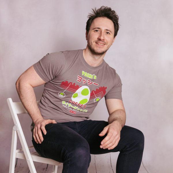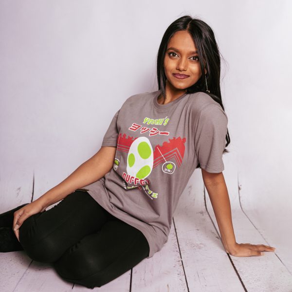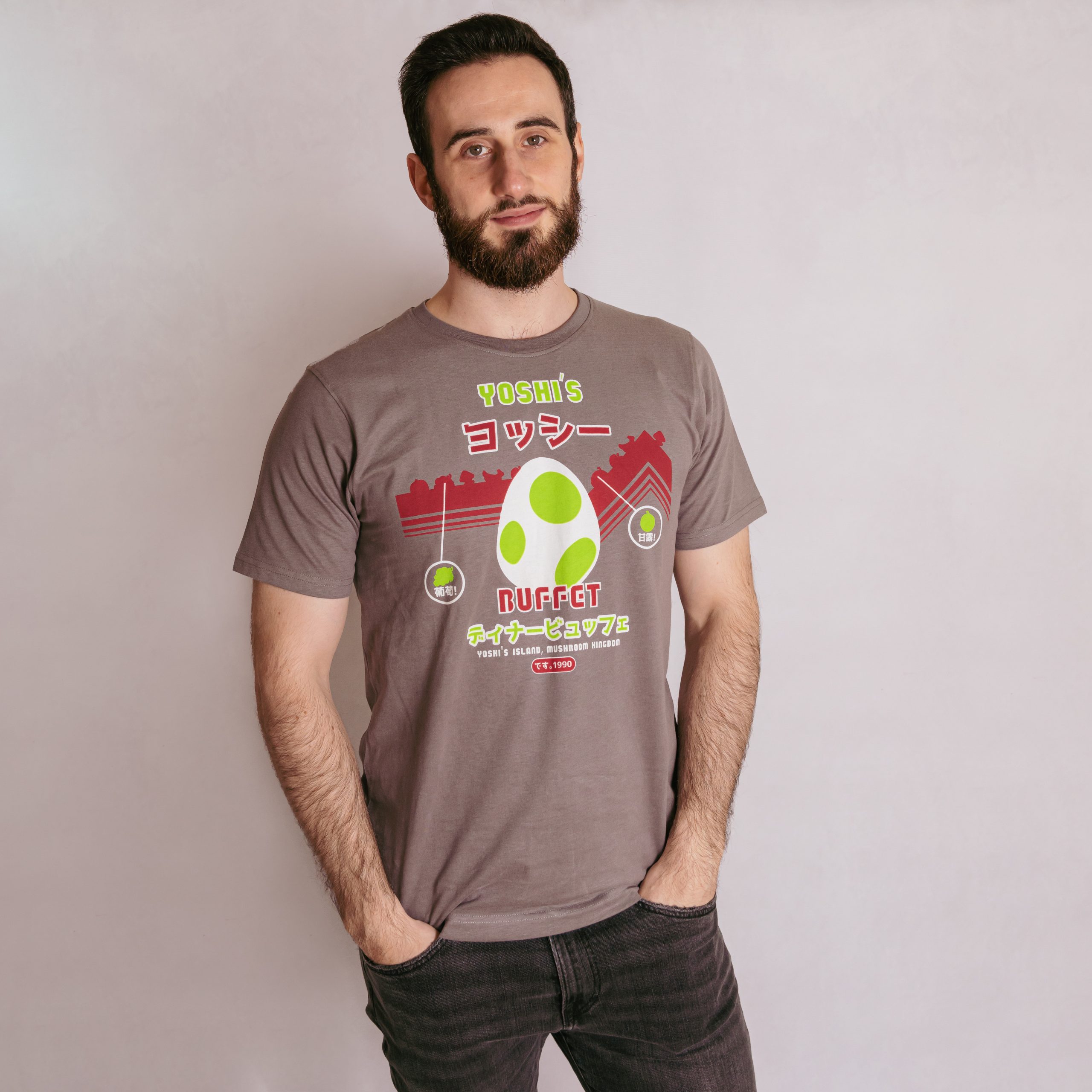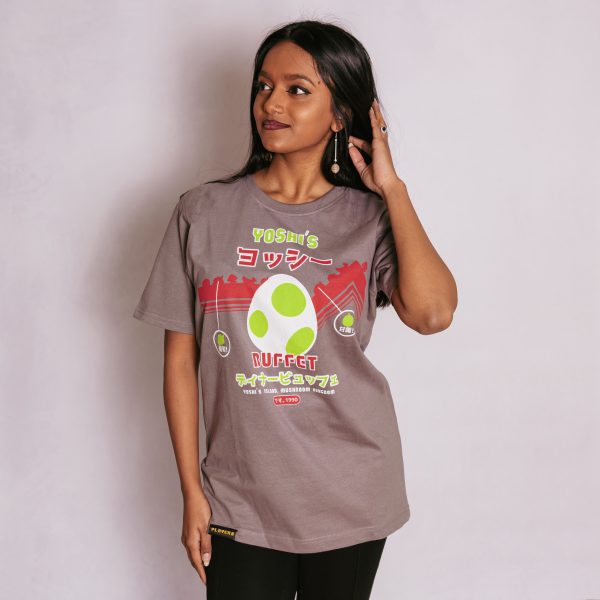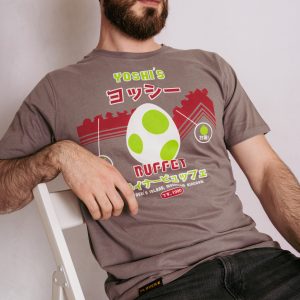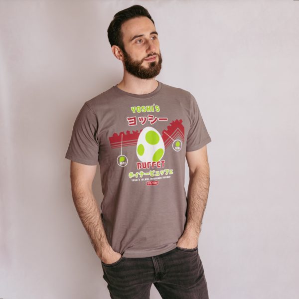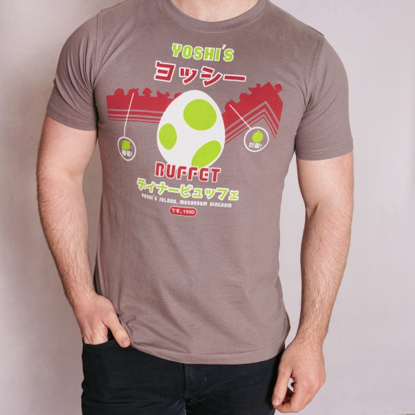The design: Yoshi, the ever hungry and trusty steed on Mario features in this collection as the owner of an all you can eat buffet. Given his appetite this might not be the best venture for him! The main feature is the Yoshi egg that he can lay and use as a projective weapon when swallowed. In the retro Famicom swoosh you have a selection of fruits and other Yoshi favourites. The kanji text reads “Dinner Buffet, YES!” and “Since the year”. Also referenced is Mushroom Kingdom and 1990 the year of his first appearance.